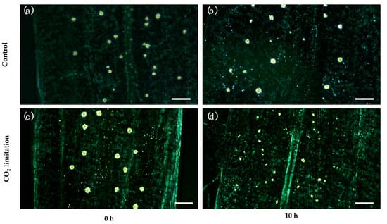 Figure 2. Paradermal view of the chlorine-bleached leaves under polarized light. CaOx crystals are visible as bright spots. Note the obvious differences in size and distribution of crystals between 0 h and 10 h under CO2 limitation. (a) Control leaf, time = 0 h, 400 ppm CO2. (b) Control leaf, time = 10 h, 400 ppm CO2. (c) Treatment leaf, time = 0 h, 11.5 ppm CO2. (d) Treatment leaf, time = 10 h, 11.5 ppm CO2. Bars = 200 μm.
