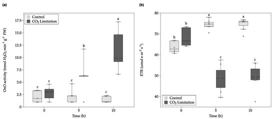 Figure 3. Fluctuations in the oxalate oxidase activity (OxO) (a), and electron transport rate (ETR) (b) of C. quitensis plants under ambient or low CO2 concentration. Plants were kept over time under constant light in airtight chambers injected either with ambient air (Control, 400 ppm CO2, white boxes) or filtered air with soda lime (CO2 limitation, 11.5 ppm CO2, gray boxes). The horizontal line indicates the mean and length of each whisker indicates the interquartile range (IQR); n = 5. Different letters represent statistically significant differences (two-way ANOVA; p < 0.05).