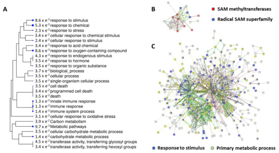 In order to identify the cellular functions affected by the biostimulant treatment, and to support data analysis, all the functional interactions between the expressed proteins were investigated in both up- and downregulated datasets and STRING suite (Figure 1). Regarding the interactions of the upregulated genes, a number of 34 nodes and 63 edges was observed (average node degree = 3.71) (Figure 1B). Considering the value of 12 as the expected number of edges for 34 nodes, this network had significantly more interactions than expected [PPI (Protein-Protein Interaction) enrichment p-value = 1.00 × e−16]. A clear, but small, network was observed, related to SAM-dependent methyltransferase and SAM superfamily. Considering the interactions of the downregulated genes (Figure 1C), 483 nodes and 1078 edges were observed (average node degree = 4.46). In addition, this network had significant enrichments (PPI enrichment p-value = 1.00 × e−16), 594 being the expected number of edges for 483 nodes. In this dataset, the visible highly interconnected subgroups were those linked to stimuli response and those linked to primary metabolism.