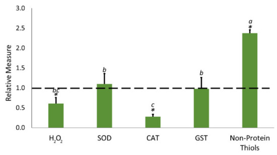 Effects of the application of the biostimulant on hydrogen peroxide (H2O2) level, superoxide dismutase (SOD), catalase (CAT), and glutathione S-transferase (GST) enzymatic activity and on non-protein thiol content. Data were calculated as relative measure, by comparing each measure recorded on the biostimulant-treated sample to the related untreated sample (dotted line). The individual raw measures for each parameter are reported in Supplementary Table S4. Each bar represents the mean ± standard deviation (SD). Lowercase letters indicate significant (p < 0.05) differences among the different relative measures, as calculated by one-way ANOVA followed by Tukey’s test. The asterisk (*) indicates statistical differences between untreated (dotted line) and treated samples, as calculated by t-test (p < 0.05). Additional statistical information is reported in Supplementary Table S5.