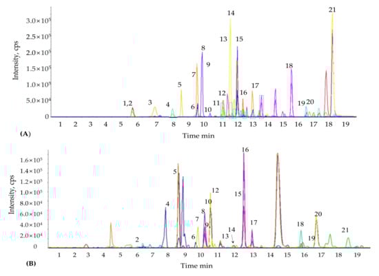 111]. Pumps (Agilent 1200, Agilent Technologies, Palo Alto, CA, USA) and an autosampler (Agilent 1100 series, Agilent Technologies, Palo Alto, CA, USA) were coupled to an API 2000 series mass spectrometer (Applied Biosystems, ON, Canada) integrated to the LC system. The chromatographic separation of phenolic compounds was performed using a C18 column (4.6 × 250 mm, 5 μm). The mass spectrometer was used in negative ion mode. The following parameters were used to determine the phenolic compounds present in the samples: nebulizer gas pressure, drying gas pressure, collision gas pressure, and curtain gas pressure set at 40, 70, 2, and 20 psi, respectively; drying gas temperature and capillary voltage were set at 350 °C and 4.5 kV, respectively. The mobile phase comprised 0.1% formic acid (HCOOH) (