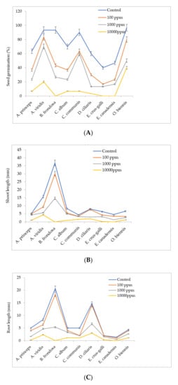 53]. Accordingly, scientific interest in controlling weeds through allelochemicals has recently increased. Studies have reported that the allelochemical components of some plant species effectively inhibit the germination and growth of weeds, which are effects primarily attributed to the phenolic compounds present in the sample extracts [