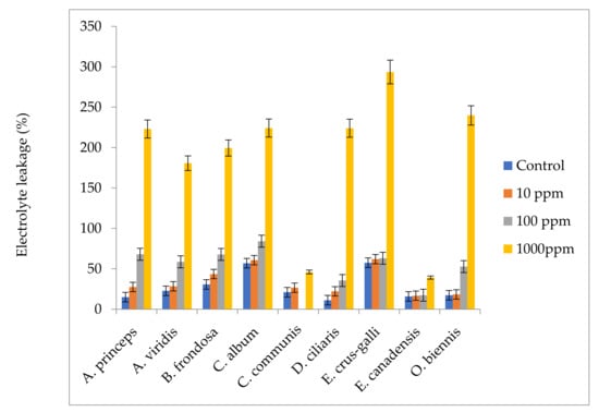 113]. The petri dishes containing cut samples were placed in a boiling water bath for 30 min and then cooled at 25 °C. The electrical conductivity of the cooled samples was then measured (ECf). Electrolyte leakage (EL) was determined according to the following equation: EL = (ECf−EC0), where ECf is the electrical conductivity at the final time and EC0 is the initial electrical conductivity.