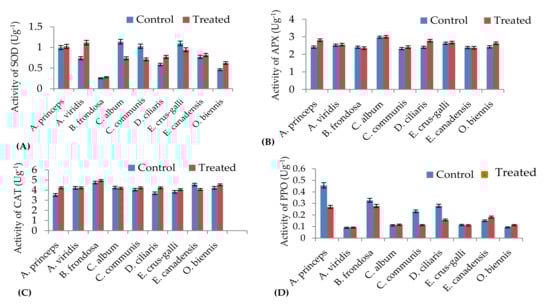 For superoxide dismutase (SOD) activity, fresh seedling leaves (1 g) of treated and non-treated (control) weeds were homogenized in a mortar and pestle using liquid nitrogen in 5 mL of extraction buffer (20 mM Tris-HCl in 1% polyvinylpyrrolidone, pH 7.4) following the method described by Beauchamp and Fridovich [