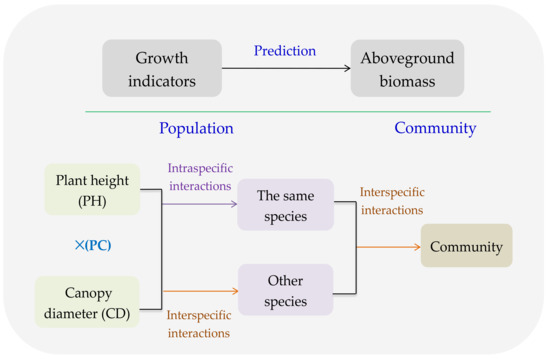 Plant height (PH) and canopy diameter (CD) reflect the vertical and horizontal allocations of AGB, and to a certain extent, the product of PH and CD (PC) represents the plant volume, which illustrates the ability to compete the limited and common resource, i.e., intraspecific competition or interspecific competition [28]. As AGB of population or community is the consequence of both intraspecific and interspecific interactions [29], PH, CD, and PC could reasonably predict AGB (Figure 1). Moreover, several major species always contribute to most of AGB in a community [30], and consequently, their GI could predict the AGB of a community (Figure 1).