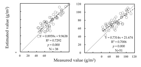 The estimated values and the measured values were significantly correlated each other at the level of p = 0.000 under two managements of grassland (Figure 2). Under no grazing, the estimated values were closer to the measured values than that under rotational grazing. Because the estimated values could be calibrated by regressive equations between themselves and the measured values under both conditions, the predictive equations were not affected by different grassland managements.