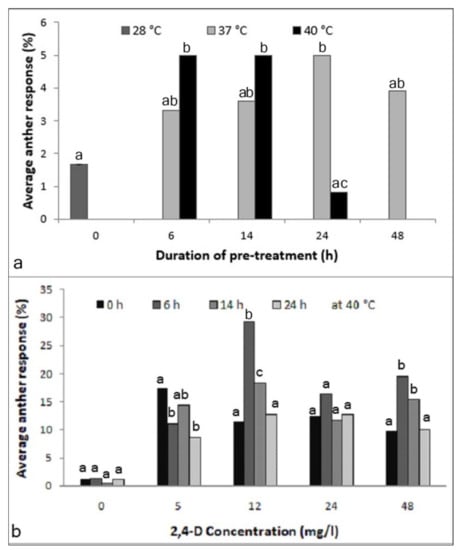 It was tested whether the 2,4-D concentration and the pretreatment durations were optimal. Anthers were cultured into the media supplemented with different 2,4-D concentrations (0, 5, 12, 24 and 48 mg/l) and then incubated at 40 °C for different time durations (0, 6, 14, 24 and 48 h).