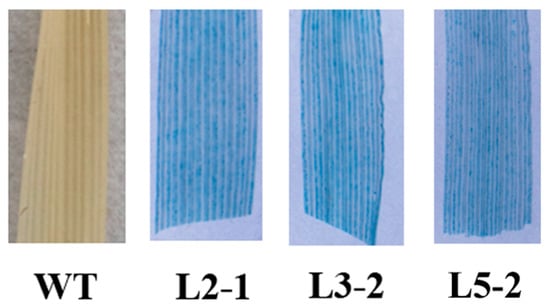 There is considerable knowledge of the AtSAG101 gene and its ability to enhance resistance to pathogens [,]. However, we did not find homologous genes of AtSAG101 in B. distachyon. In this study, AtSAG101 was transformed into B. distachyon. AtSAG101 transgenic plants were identified by PCR. Three transgenic plant lines were successfully identified to contain the AtSAG101 gene, named Lines 2-1, 3-2 and 5-2 (Figure S1). Furthermore, we analyzed β-glucuronidase (GUS) gene expression and activity in transgenic plants (Figure 1). Three transformed lines showed GUS activity, but wild type showed no detectable GUS phenotype using histological staining. These results demonstrated that AtSAG101 was successfully transformed into B. distachyon.