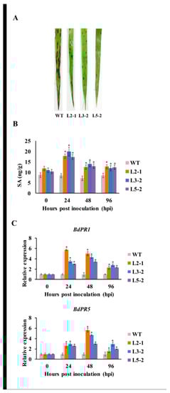 In this study, the B. distachyon Bd21-3 genotype, P. brachypodii F-CO isolate and M. oryzae RO1-1 isolate were used. Bd21-3 is susceptible to RO1-1 and F-CO. B. distachyon was grown in a 22 °C growth chamber with 16 h (h) of light and 8 h of dark. Three seedlings were grown 8 cm diameter pots with medium, and 5 weeks old plants were inoculated with F-CO. Each treatment contains WT and three different transgenic lines, three plants for each line. Parallel mock inoculations were performed using tap water. Inoculation and incubation of F-CO followed the procedures as previously described []. Inoculated leaves were harvested at 0, 24, 48 and 96 h post inoculation (hpi). The inoculation results were evaluated at 15 dpi.