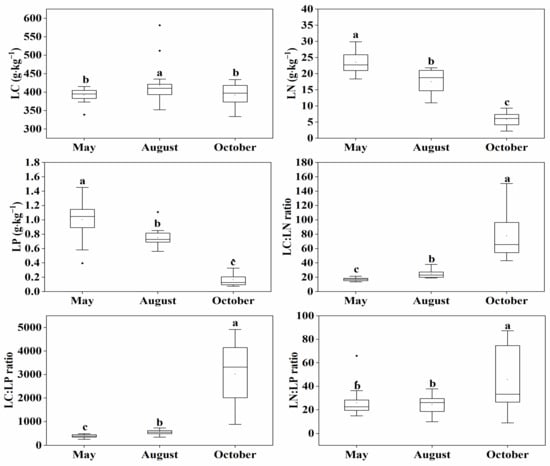 The LC, LN and LP and their ratios of P. australis (Figure 1) showed significant seasonal variations. LC was the highest (417.35 g·kg−1) at the mid-growing season (August), and was significantly higher than that of early (May) and late (October) growing season. Maximum LN and LP (23.49 and 1.0 g·kg−1, respectively) were recorded at the beginning of the growing season, and then decreased to the lowest at the late growing season (5.86 and 0.16 g·kg−1, respectively), showing a significant downward trend over the growing season. The LC:LN and LC:LP were lowest at the early growing season (17 and 429.39, respectively), and their maximum values were reached at the late growing season (77.68 and 3015.91, respectively). For LN:LP ratio, there was no significant difference between the early and mid-growing season. However, it significantly increased during the late growing season (from 24.18 in Summer to 45.67 in Autumn).