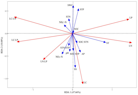 RDA analysis showed that main soil factors affecting the stoichiometry of P. australis leaves were SS, ST, SWC, SOC, NO3-N and AP, partly supporting our hypothesis. In an arid wetland ecosystem, others [7,36] also found that salt (water) is one of the most important ecological factors that restrict plant growth and has considerable significance for the life history strategy of desert plants to strengthen the effective utilization of resources under environmental stress.
