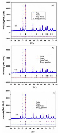 XRD patterns with Reitveld analysis for three different sized CuONPs: (a) S1 = CuONP–25 nm; (b) S2 = CuONP–50 nm; (c) S3 = CuONP–250 nm.