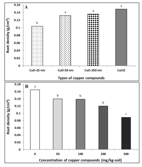 Effect of copper compound types (A) and concentrations (B) on soybean root density. The data for (B) are the aggregates of root density for all CuONPs and Cu2+ ions combined as they were not significantly different at the same concentration treatment. Same letter above the bars indicates no significant difference between the treatments according to the Fisher’s LSD test (p ≤ 0.05).