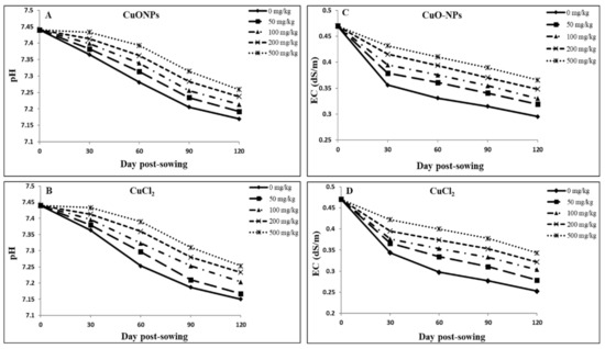 Changes in soil pH (A,B) and electrical conductivity (EC) (C,D) of soil amended with CuONPs (A,C) and CuCl2 (B,D) during the full growth period of 120 days in soybean. The data are averaged for all three types of CuONPs as they were similar among the NP types.