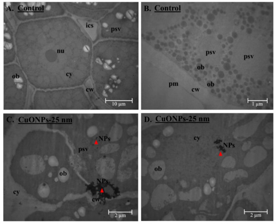 TEM analysis of ultrastructure of soybean seed embryo with CuONPs–25 nm treatment at 500 mg/kg soil (C,D) and compared with control seeds (no nanoparticles) (A,B). Electron-dense metal aggregates are clearly visible within the cell wall (cw)/plasma membrane (pm), including within the cytoplasm (cy) and/or protein storage vacuoles (psv) for the seeds with CuONPs–25 nm treatment at 500 mg/kg soil (C,D). nu = nucleus, ics = intracellular space, ob = oil bodies, NPs = nanoparticles (red triangle).