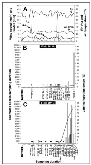 - Alderman, S.; Matyac, C.; Bailey, J.; Beute, M. Aeromycology of Cercospora arachidicola on peanut. Trans. Br. Mycol. Soc. 1987, 89, 97–103. [Google Scholar] [CrossRef]
