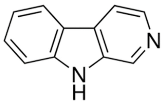 Norharmane (9H-pyrido (3,4-b) indole, NOR; Figure 1) is a secondary plant metabolite that belongs to the β-carbolines group, an indole alkaloids group [10]. It can be naturally found in plants of the Gramineae, Sapotaceae and Zygophyllaceae families. The compound was isolated for the first time from the Peganum harmala plant [11]. It is not found exclusively in land plants, but it can also be found in marine organisms such as Noctiluca miliaris or Nodularia harveyana [12]. As a matter of interest, these β-carbolines can be found in roasted coffee beans and chicory [13]. Epidemiological studies showed that there is a negative correlation between drinking coffee and the incidence of Parkinson’s disease [14] as these compounds would act as neuromodulators, inhibiting the monoamine oxidase (MAO) enzyme [15]. In addition, NOR has a number of pharmacological effects, such as the increase of insulin secretion in isolated isles of Langerhans [16], and being a compound that has a comutagenic activity [17], making NOR a compound of toxicological importance.