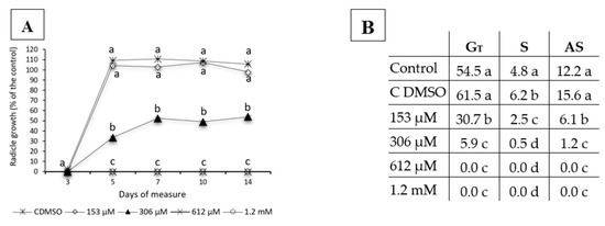 Regarding monitoring of germination and growth of Erigeron bonariensis L. (syn. Conyza bonariensis), we can see in Figure 2 that all the concentrations tested induced the inhibition of the total germination and germination speed (Figure 2B), at over 50.0% for the lowest concentration tested (153 µM) and at 90.0% for the 306 µM concentration of NOR, when compared to the control. The effect on germination was so intense that none of the seeds treated with the two highest concentrations tested (612 µM and 1.2 mM) germinated during the 14 days that the experiment lasted, and no recovery of the germination process was observed. As for growth (Figure 2A), although the effect observed was not strong, with no significant differences in seedlings that grew at a concentration of 153 µM, there was a clearly stable effect during the 14 days for the highest concentration tested, which did not induce total inhibition of germination (306 µM).