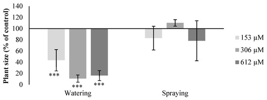 Plant size in the percentage with respect to the control of A. thaliana watered and sprayed with different concentrations of norharmane (0, 153, 306 and 612 µM) for 21 days. Asterisks indicate significant differences from controls (*** p ≤ 0.001).