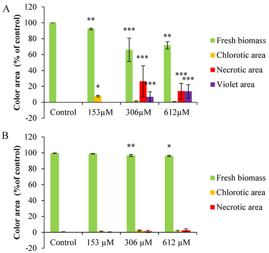 If the NOR-watered plants are observed in detail, chlorotic (yellowish) and violet areas, especially noticeable on the underside of the leaves, can be found. In fact, the colorimetric analysis of the leaves of plants watered with NOR showed significant differences in the fresh biomass at all concentrations, with a decrease of fresh biomass and an increase of chlorotic areas (Figure 5A). For the plants watered with 306 and 612 µM NOR, the reduction of fresh biomass (65% and 71%, respectively) was related to an increase of the necrotic (26% and 14%, respectively) and purple areas (6% and 13%, respectively). By contrast, the colorimetric analysis of A. thaliana leaves pulverized with NOR (Figure 5B), showed only a slight decrease of fresh biomass (green color) at the highest concentrations tested (306 and 612 µM) and it was linked to a small increase of chlorotic (yellowish) and necrotic (brown) areas.