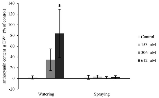 As the violet areas are normally associated to an accumulation of anthocyanins, this pigment was quantified in the plants treated with NOR (Figure 6). As with the leaf area, the plants that were pulverized with norharmane did not show significant differences between the control sample and the treatments, whereas the plants watered with 306 and 612 µM NOR considerably increased their content in anthocyanins, obtaining significant differences in the plants watered with the highest concentration (612 µM), which increased their content in 83.9% when compared with the control plants. Although the plants watered with 306 µM NOR did not show significant differences, given the high variation of the data, an increasing trend could be observed in the anthocyanin content, with an increase of 34.9% compared to the control plants.