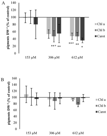 Pigments (chlorophyll a, chlorophyll b and carotenoids) content (percentage of control) of A. thaliana plants watered (A) and sprayed (B) with different concentrations of norharmane (0, 153, 306 and 612 µM) for 21 days. Asterisks indicate significant differences compared to the control (* p ≤ 0.05, ** p ≤ 0.01, *** p ≤ 0.001). Data are given in a percentage with respect to the control.