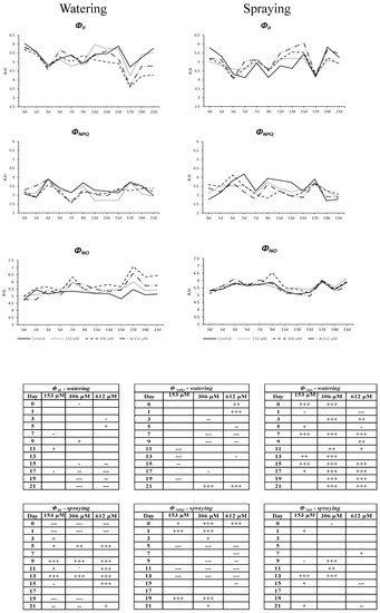 Mean values, expressed in arbitrary units (AU), of ΦII, ΦNPQ and ΦNO from A. thaliana adult plants watered or sprayed for 21 days with different concentrations of norharmane (0, 153, 306 and 612 µM). Tables show the statistical significance compared to the control on each day and treatment (+, stimulatory difference; -, inhibitory difference; + or -, p ≤ 0.05, ++ or --, p ≤ 0.01, +++ or --- p ≤ 0.001).