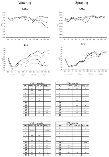 Mean values, expressed in arbitrary units (AU), of Fv/Fm and electron transport rate (ETR) in A. thaliana adult plants watered or sprayed for 21 days with different concentrations of norharmane (0, 153, 306 and 612 µM). Tables show the statistical significance compared to the control on each day and treatment (+, stimulatory difference; -, inhibitory difference; + or -, p ≤ 0.05, ++ or --, p ≤ 0.01, +++ or --- p ≤ 0.001).
