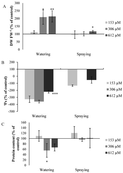 Values for the DW FW−1 ratio (A), osmotic potential, Ψs (B) and protein content (C) of A. thaliana plants watered or sprayed with different concentrations of norharmane (0, 153, 306 and 612 µM) for 21 days. Asterisks indicate significant differences compared to the control (* p ≤ 0.05, ** p ≤ 0.01, *** p ≤ 0.001). Data are given in a percentage with respect to the control.