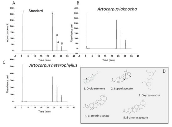 - Maneechai, S.; De-Eknamkul, W.; Umehara, K.; Noguchi, H.; Likhitwitayawuid, K. Flavonoid and stilbenoid production in callus cultures of Artocarpus lakoocha. Phytochemistry 2012, 81, 42–49. [Google Scholar] [CrossRef]