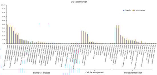 Gene Ontology (GO) functional classification of microRNA (miRNA) target genes identified in the J. regia and J. microcarpa genomes. y-axis represents the percentage of the number of target genes.