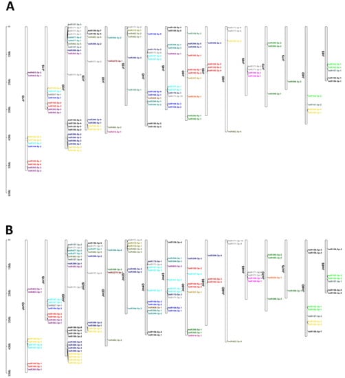 Chromosomal distribution of the pre-miRNAs in the J. regia (A) and J. microcarpa (B) genomes. The colors of the miRNA accession names indicate different miRNA families.