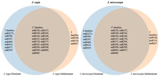 Within the J. regia genome, 70 and 49 pre-miRNAs were located in the D and S subgenomes, respectively (Figure 2; Table S3). Within the J. microcarpa genome, 70 and 51 pre-miRNA were located in the D and S subgenomes, respectively (Figure 2; Table S4). A larger proportion of pre-miRNAs were encoded in the D subgenome than in the S subgenome if both species are considered jointly (p = 0.001, χ2 test of equal proportions on combined data, df = 1). Individually, p = 0.108 and p = 0.168 (χ2 tests, df = 1, corrected), for J. regia and J. microcarpa, respectively, where here and thereafter the corrected p-values are adjusted for two species by the Bonferroni method unless otherwise mentioned. A similar observation was made for the distribution of mature miRNAs within the two genomes. Of the 27 J. regia miRNA families, 24 and 20 were located in the D and S subgenomes, respectively; 17 miRNA families were in both the D and S subgenomes, 7 were specific to the D subgenome and 3 were specific to the S subgenome (Figure 3). In the J. microcarpa genome, of the 26 miRNA families, 23 and 20 were encoded in the D and S subgenomes, respectively; 17 families were encoded in both the D and S subgenomes, 6 families were specific to the D subgenome, and 3 families were specific to the S subgenome (Figure 3).