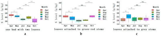 Boxplots for dynamic changes of N level (g N kg−1 DW) in the three categories of leaves: one bud with two leaves (a), leaves attached to green-red stems (b), and to grey stems (c), during the growing seasons. The values were calculated based on the twenty tea varieties described in Table A1. The box represents the interquartile range (IQR), the bisecting line represents the median, and the whiskers represent 1.5 times the IQR. Asterisks indicate significant differences between averaged N levels of two consecutive rounds, * p < 0.1, ** p < 0.05, *** p < 0.01 (t-test); NS, not significant.