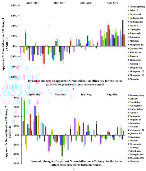 Dynamic changes of apparent N remobilization efficiency for leaves attached to green-red stems (a) and to grey stems (b) of the twenty tea plant varieties during the growing seasons. Values are means ± standard (SD) (n = 3). Error bars indicate SD.