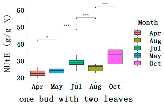 Boxplot for dynamic N utilization efficiency (NUtE, g/g N) for the harvest leaves of the twenty tea plant varieties during the growing seasons. The box represents the interquartile range (IQR), the bisecting line represents the median, and the whiskers represent 1.5 times the IQR. Asterisks indicate significant differences between two consecutive averaged NUtEs, * p < 0.1, *** p < 0.01 (t-test).