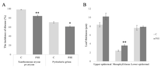 The Xanthomonas oryzae pv.oryzae and Pyricularia grisea inoculations were conducted on two-week-old rice seedlings of control and 50 ppm PHI application, and the incidence of infection was calculated after two weeks. Two hundred seeds of each replicate were used for each replicate. Three replicates were performed for each sample. Spray leaf assay was used for disease assessment. The spores of Pyricularia grisea (3 × 105 spores/ml) and Xanthomonas oryzae pv.oryzae (3 ×105 spores/ml) was sprayed on the leaves of rice seedlings every 7 days for two weeks. The incidence of infection was the percentage of infected seedlings.