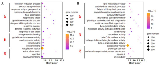 Figure S1). The DEGs with known annotations could be categorized into 52 regulatory functional classes. The up-regulated genes were enriched in GO terms of response to stress, defense response to fungus, and plasma membrane. The GO enrichment of down-regulated genes refers to carbohydrate metabolic process, hydrolase activity, plant-type cell wall, and apoplast. The up-regulated genes were mainly enriched in defense-related processes, whereas down-regulated genes were enriched in metabolic processes (