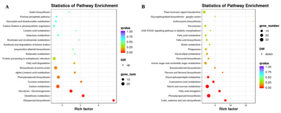Figure 4). These pathways included phenylpropanoid biosynthesis (ko00940), starch and sucrose metabolism (ko00500), and plant hormone signal transduction (ko04075). The PHI-induced DEGs were most enriched in phenylpropanoid and glycolysis pathways. There were 21 and 20 up-regulated genes, 34 and 6 down-regulated genes involved in phenylpropanoid and glycolysis pathways, respectively. Among the 25 DEGs identified in plant pathogen interaction pathway (ko04626), 14 genes were up-regulated, and 11 genes were down-regulated. There were 16 up-regulated and 20 down-regulated genes in plant hormone signal transduction.