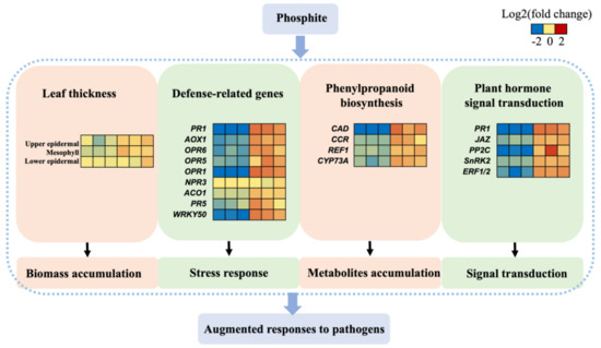 Figure 5). In the phenylpropanoid pathway, many phenolics were synthesized. Phenolics were induced during the process of pathogen attack, and it was important in the defense response. Transcripts involved in the phenolic synthesis pathway were significantly changed after PHI treatments. Araujo et al. (2015) found that mango plants sprayed with PHI reduced the Ceratocystis fimbriata development. The concentrations of phenolic compounds were higher in mango plants sprayed with PHI [