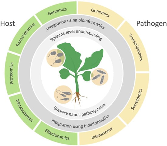 Here, we review the current status of the application of omics technologies to understand the molecular aspects of host–pathogen interactions in B. napus and other Brassica crops. We first discuss the application of omics technologies in the host, in relation to the identification of candidate QTL/R genes. We then discuss progress in pathogen research, focusing on the application of omics tools in the discovery of pathogenicity genes. Lastly, we review future perspectives and prospects for the utilisation of omics technologies in Brassica–pathogen research for breeding high-quality, more-resistant crop varieties.
