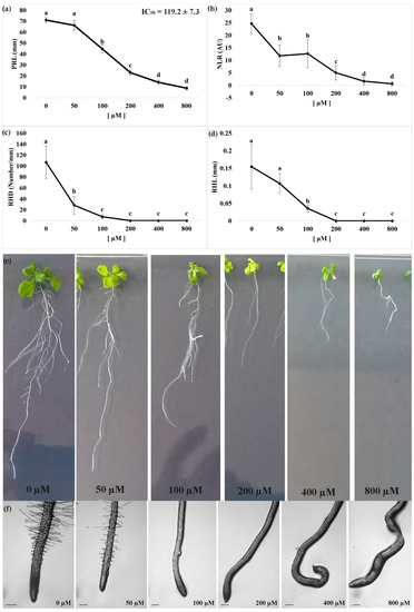 - Araniti, F.; Bruno, L.; Sunseri, F.; Pacenza, M.; Forgione, I.; Bitonti, M.B.; Abenavoli, M.R. The allelochemical farnesene affects Arabidopsis thaliana root meristem altering auxin distribution. Plant Physiol. Biochem. 2017, 121, 14–20. [Google Scholar] [CrossRef] [PubMed]