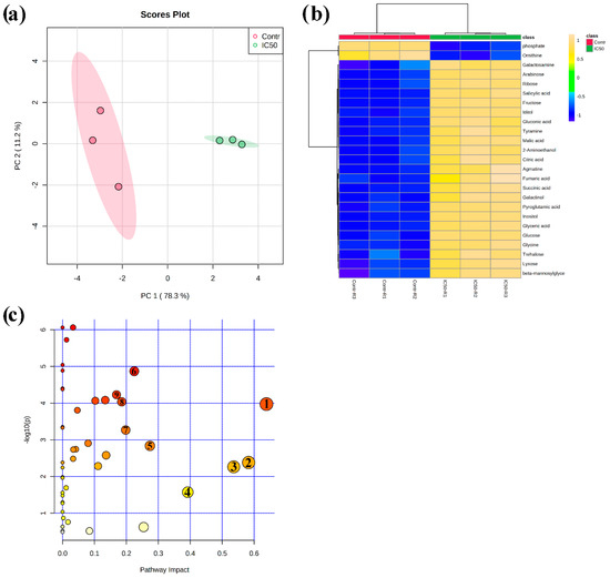 | Metabolites | FC: Control/IC50 | p-Value (t-Test) | Biochemical Classes |