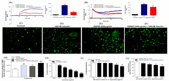 Effects of hot water extract of A. squamosa leaves on (A) membrane potential and (B) intracellular calcium in BRIN BD11 cells, (C–G) glucose uptake in differentiated 3T3L1 adipocyte cells, (H,I) starch digestion and (J) glucose diffusion in vitro. Changes of fluorescence intensity in differentiated 3T3L1 adipocytes incubated with hot water extract of A. squamosa leaves (HWAS; 200 µg/mL) + 50 nM 2-NBDG in the (E) absence or (F) presence of 100 nM insulin. Images were taken at 10× magnification. Values are Mean ± SEM for n = 6 for membrane potential and intracellular calcium, n = 4 for glucose uptake, starch digestion and glucose diffusion. * p < 0.05, ** p < 0.01 and *** p < 0.001 compared to control.