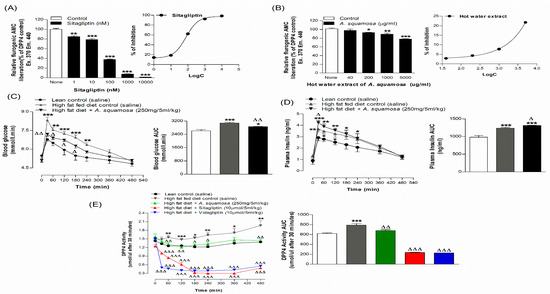 Effects of hot water extract of A. squamosa on (A,B) DPP-IV enzyme activity in vitro, (C,D) glucose tolerance and (E) plasma DPP-IV in high-fat fed rats fasted for 6 h. Glucose tolerance, plasma insulin and DPP-IV enzyme activity were measured prior to and after oral administration of glucose alone (18 mmol/kg body weight, control) or with A. squamosa leaves (250 mg/5 mL/kg body weight). Values are Mean ± SEM for n = 3 for DPP-IV enzyme activity in vitro and n = 6 for glucose tolerance, plasma insulin and DPP-IV in vivo. * p < 0.05, ** p < 0.01 and *** p < 0.001, compared to normal control and Δ p < 0.05, ΔΔ p < 0.01 and ΔΔΔ p < 0.01 compared to high-fat fed diet control.