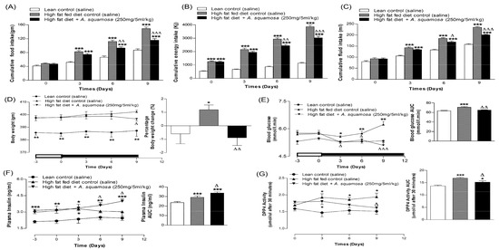 Effects of 9 days treatment of twice daily oral administration of hot water extract of A. squamosa leaves on (A) food intake, (B) energy intake, (C) fluid intake, (D) body weight, (E) blood glucose, (F) plasma insulin (G) and DPP-IV enzyme activity in high-fat fed rats. A. squamosa leaves extract was administered orally (250 mg/5 mL/kg body weight) twice daily. Values are Mean ± SEM for n = 8 rats. * p < 0.05, ** p < 0.01 and *** p < 0.001 compared to lean control. Δ p < 0.05, ΔΔ p < 0.01 ΔΔΔ p < 0.001 compared to high-fat fed diet control at corresponding time-point.