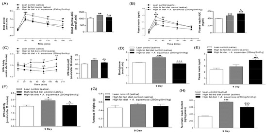 Chronic effects of twice daily oral administration of hot water extract of A. squamosa leaves on (A) glucose tolerance (B) plasma insulin and (C) plasma DPP-IV on day 6 and (D) blood glucose, (E) plasma insulin, (F) plasma DPP-IV, (G) pancreas weight and (H) pancreatic insulin content on day 9 in high-fat fed rats. A. squamosa leaves extract was administered orally (250 mg/5 mL/kg body weight) twice daily. Glucose tolerance was assessed by oral administration of glucose (18 mmol/kg). Values are Mean ± SEM with n = 8. * p < 0.05, ** p < 0.01 and *** p < 0.001 compared to lean control. Δ p < 0.05, ΔΔ p < 0.01 ΔΔΔ p < 0.001 compared to high-fat fed diet control at corresponding time-point.