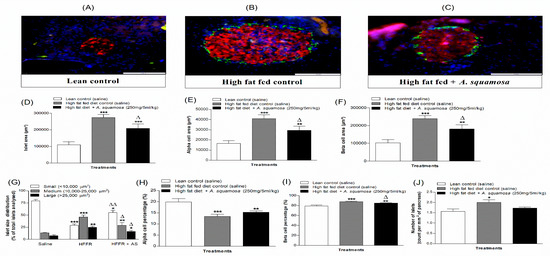 Effects of 9 days treatment of hot water extract of A. squamosa leaves on islet morphology in high-fat fed rats. Representative images of (A) lean control, (B) high-fat fed control and (C) high-fat fed rats treated with hot water extract of A. squamosa (250 mg/5 mL/kg), showing insulin in red, glucagon in green and DAPI in blue, (D) islet area, (E) alpha cell area, (F) beta cell area, (G) islet size distribution, (H) alpha cell percentage, (I) beta cell percentage and (J) number of islets (per mm2) respectively. Values are mean ± SEM for n = 8 (~100 islets per group). * p < 0.05, ** p < 0.01 and *** p < 0.001 compared to lean control. Δ p < 0.05 and ΔΔ p < 0.01 compared to high-fat fed diet alone (control).