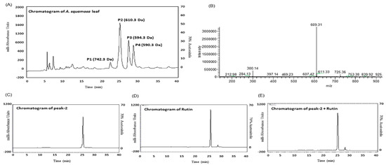 Representative HPLC profile of (A) hot water extract of A. squamosa leaves, (B) LC-MS analysis of peak samples were separated on a Spectra System LC using a Kinetex 5 µm F5 LC column ((150 × 4.6 mm) (Phenomenex), (C) Peak 2, (D) Rutin and (E) peak 2 + Rutin eluting from analytical C-18 column for over 40 min. The column was equilibrated with 0.12% (v/v) TFA/water at flow rate of 5.0 and 1.0 mL/min respectively. The concentration of the eluting solution was raised using linear gradients from 0% to 20% acetonitrile over 10 min, to 70% over 40 min. Details of peaks corresponding to A. squamosa leaves and rutin are presented in the chromatogram. UV detection was set at 220 and 360 nm and 1 mg/mL sample was injected for each run. In the chromatogram, P represents the peak in different retention time (RT). The mass-to-charge ratio (m/z) versus peak intensity was determined. Fragments of “peak-1 to 4” represents the molecular weight of unknown compounds with m/z 742.3 to 590.3 Da (data not shown) respectively.
