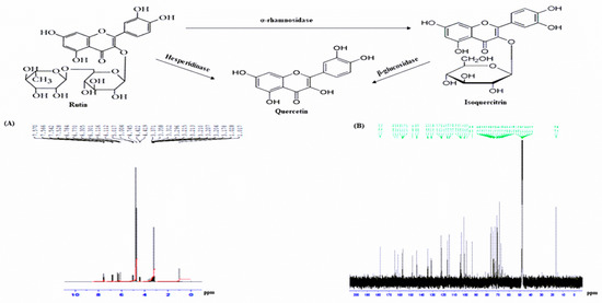(A) 1H-NMR, (B) C13-NMR spectrum and isolated compound (rutin) from peak-2 sample obtained following RP-HPLC of hot water extract of A. squamosa leaves and its metabolites, isoquercitrin and quercetin. Proton-decoupled natural abundance C13-NMR and 1H-NMR spectrum of peak-2 sample of hot water extract of A. squamosa leaves (obtained from chromatograph over the period of 0 to 70% acetonitrile from 0 to 40 min with retention time of 25 min) at 40 °C. The spectrum was obtained at 600 and 150 MHz after 119,044 transients (14 h) by the pulsed Fourier transform method on a Varian XL-100 A spectrometer. Representative structure of flavonoids, corresponding to the structure of rutin (Quercetin 3-rutinoside), isoquercitrin and quercetin are C27H30O16), C21H20O12 and C15H10O7.